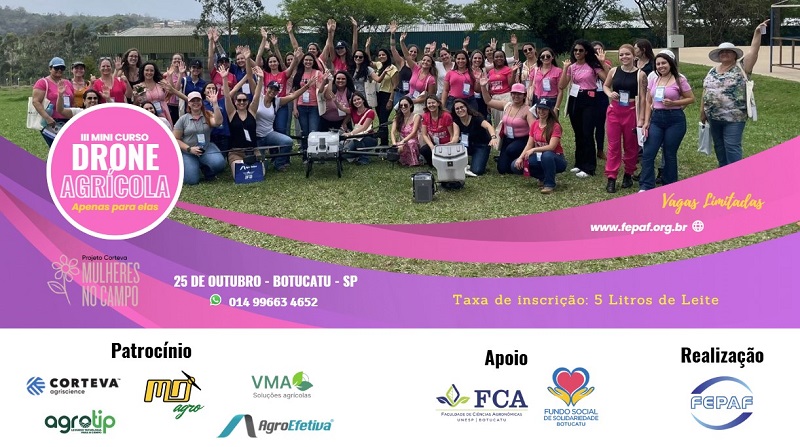 As inscrições podem ser feitas até o dia 20 de outubro de 2025, pelo site: fepaf.org.br ou diretamente no link: eventos.fepaf.org.br/evento/ev251–iii-minicurso-drones-na-agricultura-para-elas.